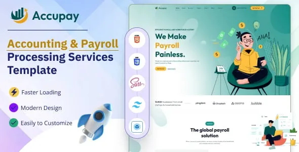 Invest in Accupay today and streamline your accounting and payroll processing services with style and efficiency.Elevate your accounting and payroll processing services with Accupay – the ultimate HTML Tailwind CSS template designed to impress and engage your audience.