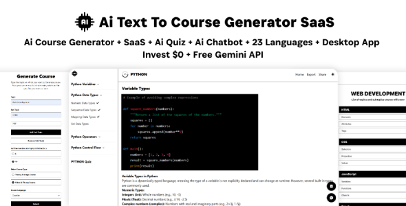 Ai Text To Course Generator using Google Gemini. Users input a topic, optionally with subtopics, and the web app generates a structured list of topics and subtopics based on the input. Then web app generates a Ai course covering all the topics and subtopics. The generated courses will be offered in two formats: a theory plus image course and a theory plus video course. This web app will be a Software as a Service (SaaS) product, where generating theory plus video courses will be a paid feature, while theory plus image courses will be available for free. Paid users will also have the flexibility to select the number of topics they wish to include in their course. This web app is educational content creation, providing users with tailored courses at their convenience. User can also export or download entier course into PDF. User can generate course in 23 different languages and can generate ai quiz / exam in 23 different languages. User can also chat with ai teacher to clear doubts, take personal notes, share course and download desktop application for windows and macOS. For more info about the app scroll down.