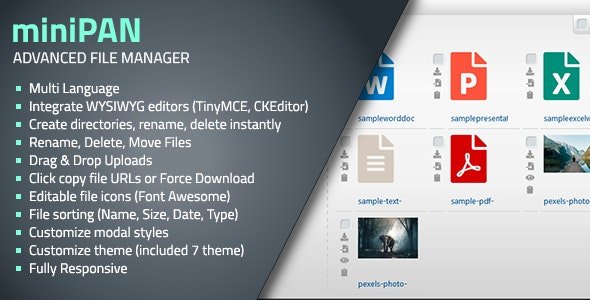 The miniPAN is a PHP based file management script, that is seamlessly integrated with TinyMCE, CKEditor. This script can also be used standalone and it’s easy to integrate with your backend system.