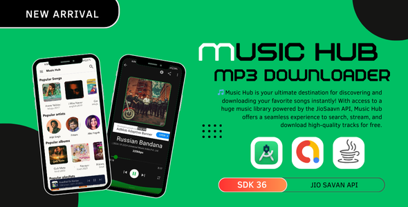 Music Hub is a premium Android application developed using Java, designed for users to easily search, stream, and download high-quality MP3 songs. It provides access to a wide variety of music, allowing users to download songs in 320kbps bitrate for a superior listening experience. Built with the latest Android SDK 36, Music Hub ensures compatibility with modern Android devices and versions up to Android 15.