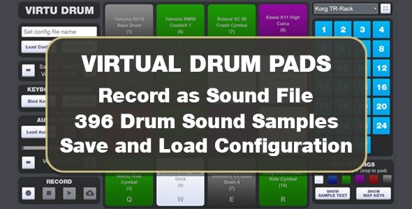 Virtu Drum Pads is virtual drum kits online that very easy to use, you can choose from 396 drum sound samples to create, save and edit your drum pads and record it as audio files. To use this drum pads online, drag and drop any drum sound samples from the sound sample list box to the pad buttons, you can use any keys on the keyboard to mapping the sound sample or simply just touch the pad buttons.
